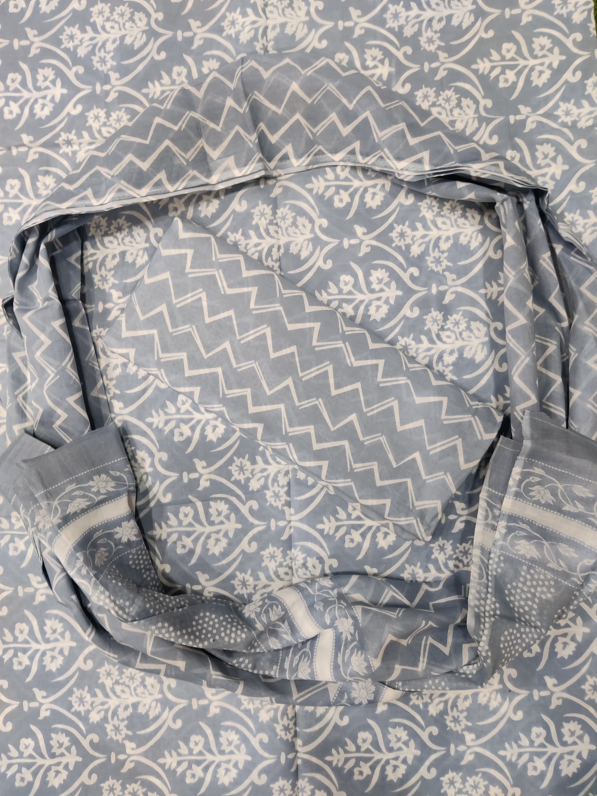This suit set is crafted from premium quality soft cotton fabric, ensuring a comfortable and lightweight feel all day long. The natural weave of cotton makes it breathable against the skin, making it an excellent choice for all seasons. The accompanying full-size malmal cotton dupatta is known for its softness and flowy texture, adding a classy and elegant touch to your look. The bottom is also made from cotton fabric, maintaining a perfect balance of comfort and style throughout the set.