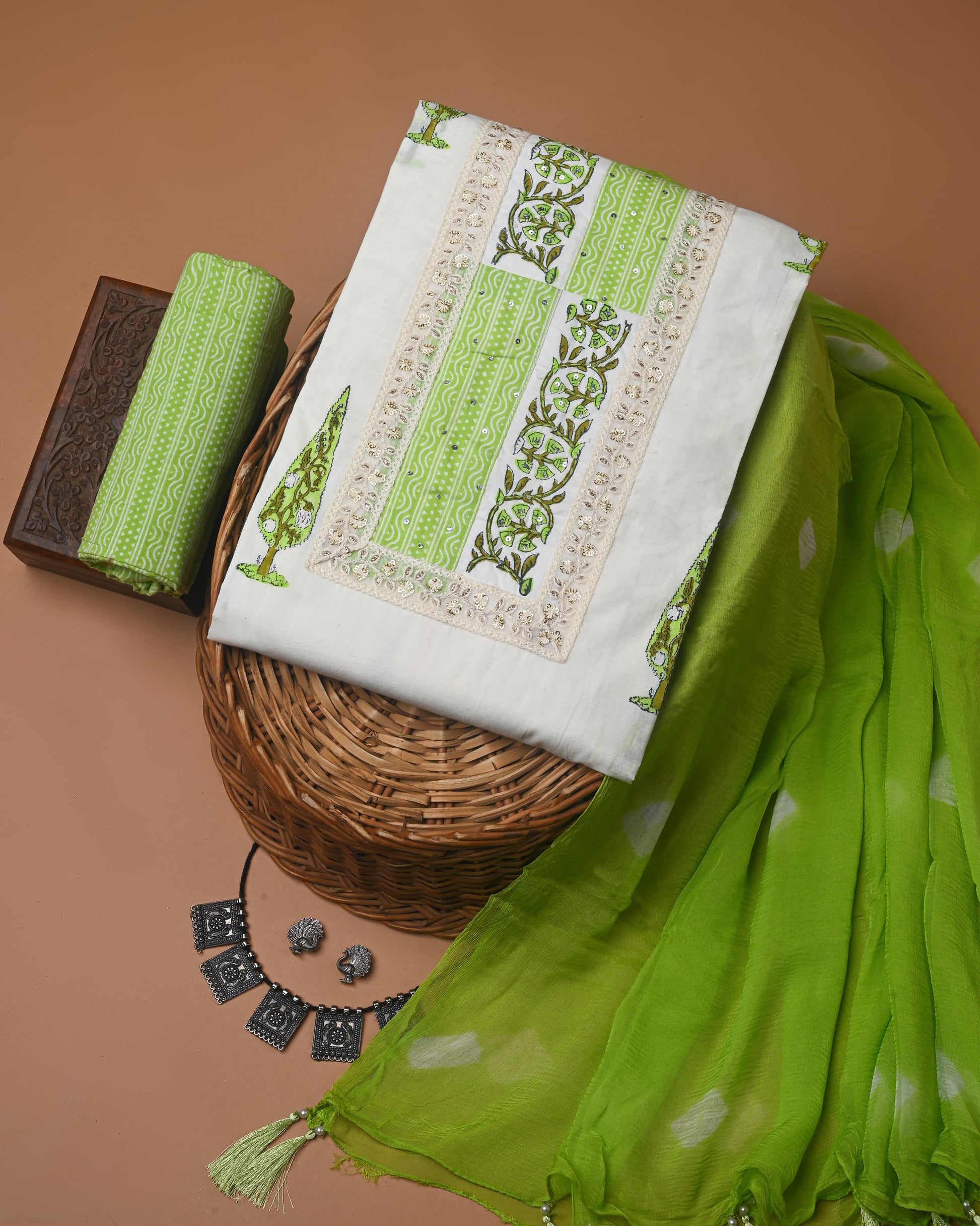 Discover the fresh allure of our latest collection with this beautiful Cotton Suit. The breathable cotton fabric ensures all-day comfort, while the airy chiffon dupatta adds a touch of graceful movement. Intricate zari gotapatti detailing catches the light, and the richly embroidered multi-colored neckline makes a captivating statement.